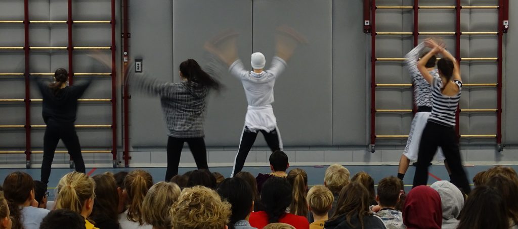 Voorstelling De Dutch Dance Division Het gezelschap De Dutch Dance Division speelde en danste een sprankelende voorstelling rond het thema pesten in al zijn facetten. Het gezelschap schuwde lastige punten niet en wist hiermee leerlingen te confronteren en tot denken aan te zetten.