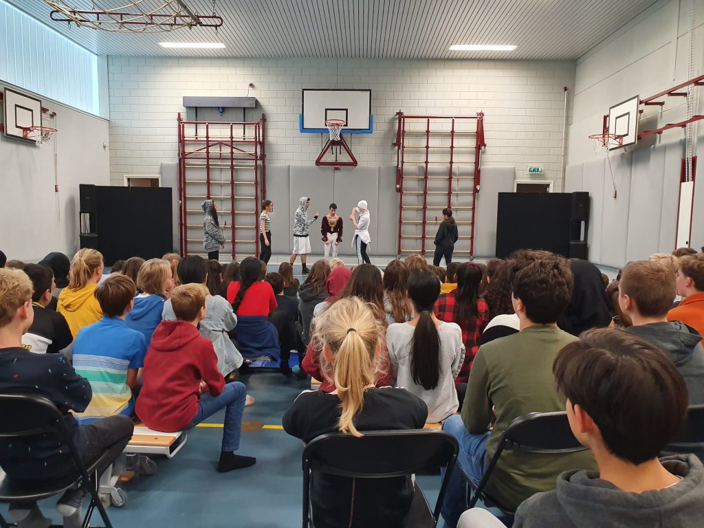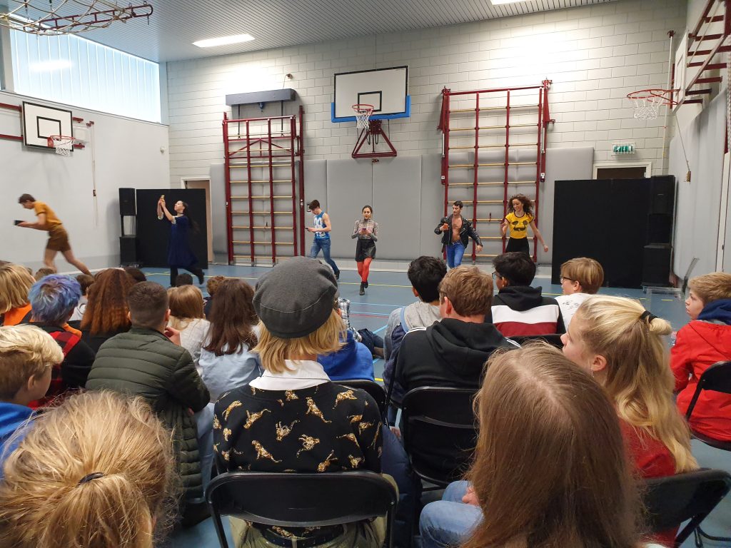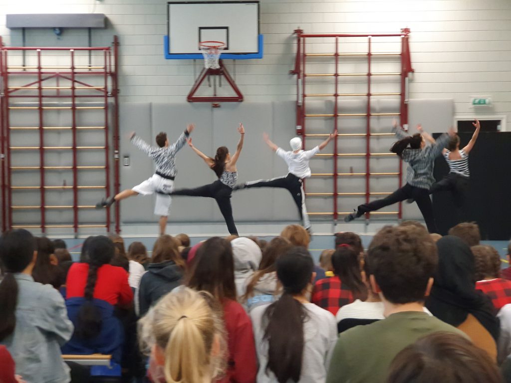 Vorige week dinsdag stond voor klas 1 en 2 in het teken van de voorstelling #PEST. De geïmponeerde leerlingen werden door de dansers van De Dutch Don’t Dance Division (afkomstig uit Canada, Argentinië, Italië en Frankrijk) ondergedompeld in een wereld waarin sprake was van buitensluiten, verbaal geweld, lichamelijk grensoverschrijdend gedrag en cyberpesten. In het nagesprek en de workshop gingen de leerlingen door middel van reflectie, dans en interactie dieper op deze materie in.